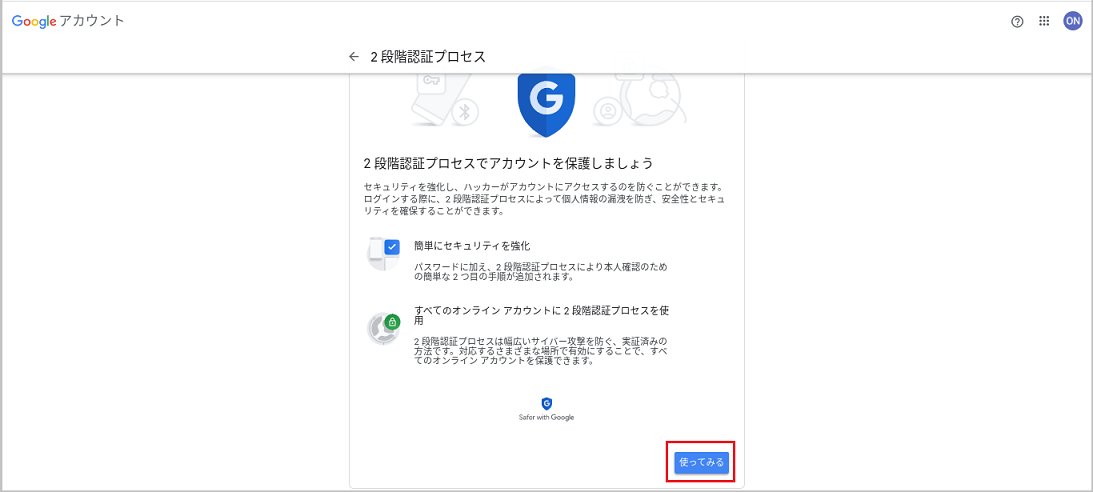 ユーザーのGoogleアカウント(https://myaccount.google.com/)のページに、[2段階認証プロセス]が表示されるようになります。