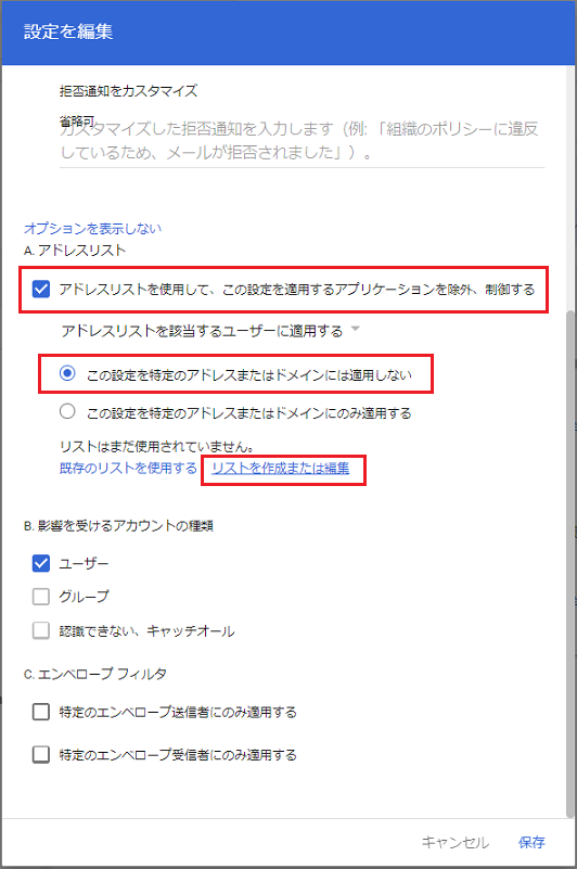 これにより、アドレスリストで指定した外部ドメインやメールアドレスに対しては、特別にメールを送付できるようになります。