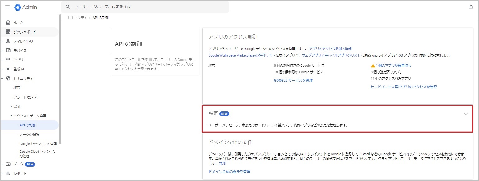 管理コンソールから[セキュリティ]⇒[アクセスとデータ管理]⇒[APIの制御]⇒[設定]を開きます。